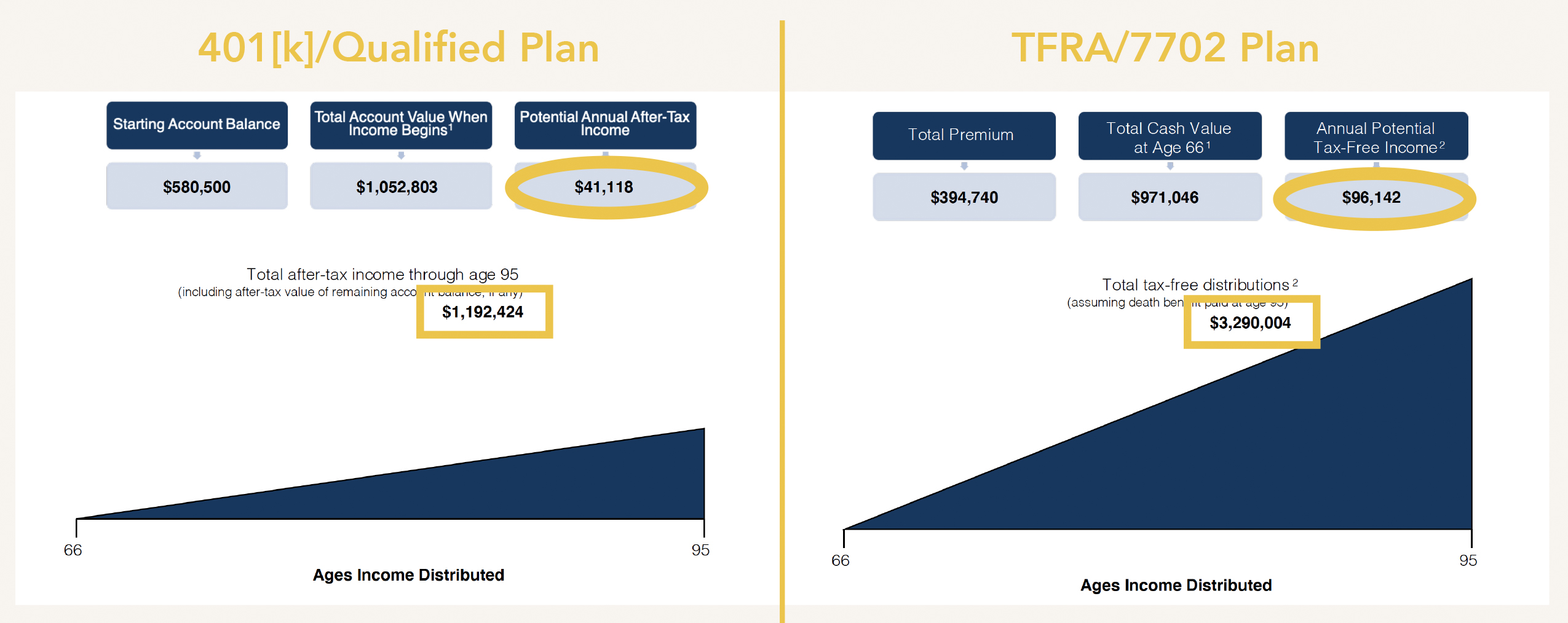 From these reports you can see the income from a Section 7702 plan is over 100% more than the Section 401(k) plan